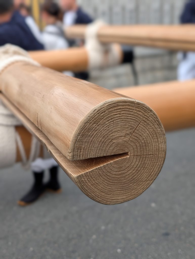 太鼓台の横棒に切り込みを入れる理由は、太鼓台をさしあげる際の掛け声に合わせて、横棒をスムーズに持ち上げたり、肩の入れ替えをしたりするためのあるんだとか😲